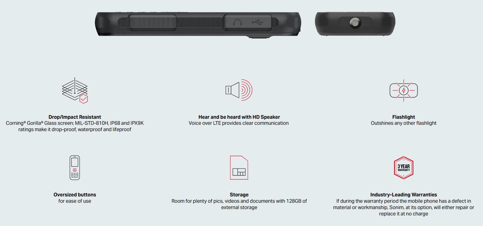 Sonim XP100 er sterkur og einfaldur farsími hannaður fyrir krefjandi aðstæður, hvort sem það er á vinnustað eða í útivist. Hann er með Corning® Gorilla® Glass skjá og uppfyllir ströngustu staðla fyrir höggþol, vatnsheldni og endingu (MIL-STD-810H, IP68 og IPX9K). 4G/VoLTE stuðning, stóra hnappa til að auðvelda notkun og öflugt vasaljós..