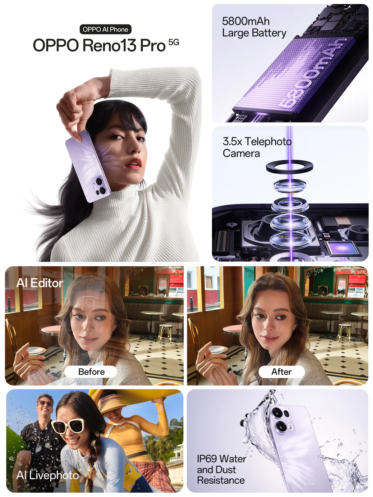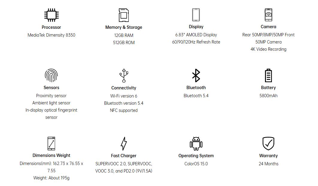 Mjög öflugur Mediatek Dimensity 8350 örgjörvi, 512GB geymsla og 12GB LPDDR5X vinnsluminni, WiFi 6e, BT 5,4 – Frábær 50MP Sony IMX890 aðalmyndavél með OIS (hristivörn),  50MP Telephoto (optical) með 3,5x stækkun og OIS (hristivörn) ásamt 8MP 116˚ víðlinsu auk 50MP frammyndavél.  5800mAh rafhlaða sem styður 80w SuperVooc hraðhleðslu sem hleður 50% á 20 mín, getur hlaðið önnur tæki.  Fingrafaraskanni undir skjá, IP68/69 vatns og rykvörn og.  Hleðslutæki fylgir ekki.