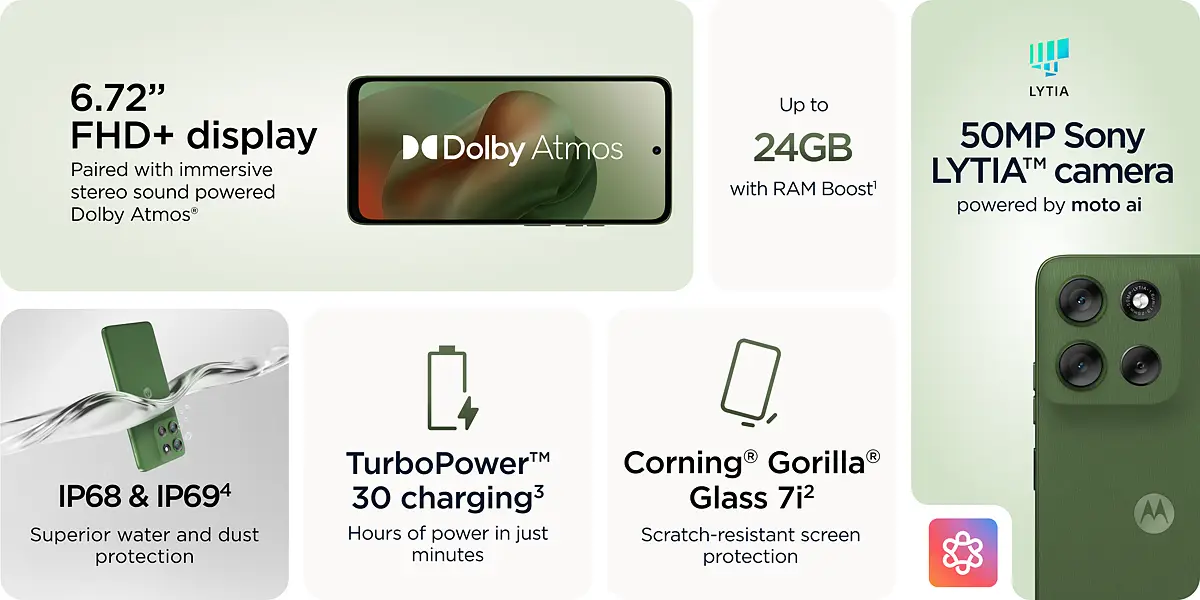 6,72″ FHD 120Hz skjá með Gorilla glass 7i vörn. Öflugur 8 kjarna Dimensity 7060 – 5G örgjörvi, 50MP Sony LYTIA aðalmyndavél með f/1.8 ljósopi og OIS (hristivörn), 8MP víðlinsa auk 32MP frammyndavél. Stór 5200mAh rafhlaða, fingrafaraskanna á hlið, Dolby Atmos Stereo hljómur, NFC (til að greiða með símanum). 3,5mm, BT 5,3 heyrnatólatengi, 256GB geymsla – 8GB vinnsluminni og stuðningur við microSD kort. Íslenska í valmynd ! Silkon hlíf fylgir með.