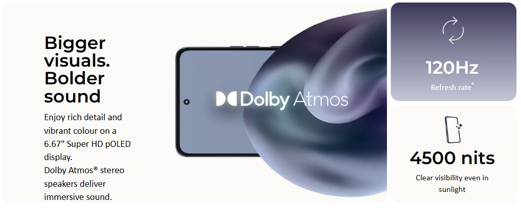 Bjartur, litríkur og skarpur 6,67″ LTPO pOLED HDR10+ Super HD (1220×22712) 120Hz skjár. Öflugur Dimensity 7300 5G – 8 kjarna örgjörvi, 3 myndavélar með Moto Ai og þar á meðal 50MP Sony LYTIA aðalmyndavél með OIS (hristivörn) – auk 8MP víðlinsu, 32MP selfie. Dolby Atmos stereo, 5200mAh rafhlaða, styður 30W hraðhleðslu, fingrafaraskanni og andlitsgreining. 256 geymsla – 8GB vinnsluminni. NFC (hægt að greiða með símanum) Íslenska í valmynd og vönduð hlíf fylgir með.