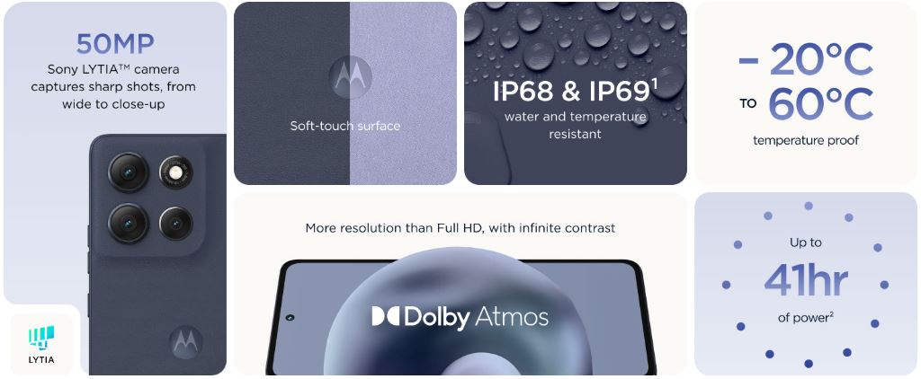Bjartur, litríkur og skarpur 6,67″ LTPO pOLED HDR10+ Super HD (1220×22712) 120Hz skjár. Öflugur Dimensity 7300 5G – 8 kjarna örgjörvi, 3 myndavélar með Moto Ai og þar á meðal 50MP Sony LYTIA aðalmyndavél með OIS (hristivörn) – auk 8MP víðlinsu, 32MP selfie. Dolby Atmos stereo, 5200mAh rafhlaða, styður 30W hraðhleðslu, fingrafaraskanni og andlitsgreining. 256 geymsla – 8GB vinnsluminni. NFC (hægt að greiða með símanum) Íslenska í valmynd og vönduð hlíf fylgir með.