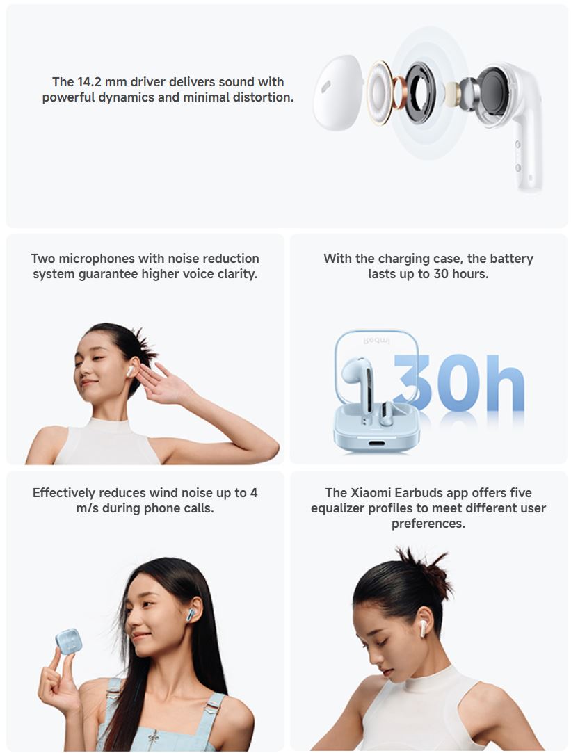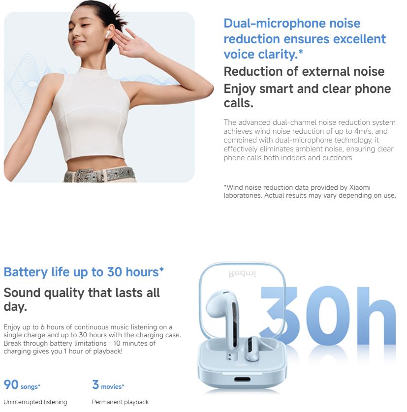 Redmi Buds 6 Active þráðlaus eru með Google Fast Pair, IPX4 skvettuvörn, Bluetooth 5.4, Flash charge (10mín hleðsla endist í klukkutíma hlustun), og 30 tíma heildar rafhlöðuending, Dual-Mic hávaðaminnkun skilar skýrari tali, 14,2mm hátalari gefur frábæran hljóm og 5 tónstillingar.